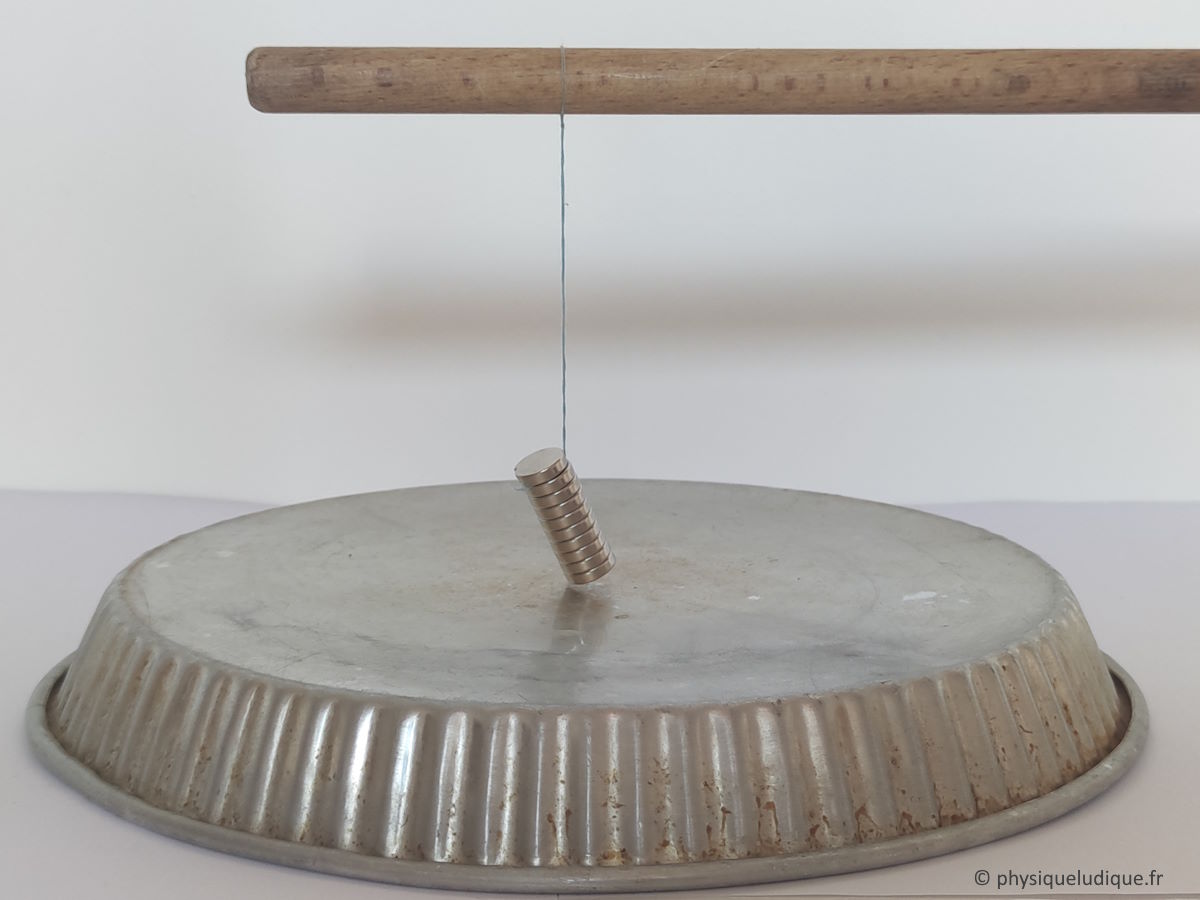 Une expérience, simple à réaliser, mettant en évidence le freinage par courants de Foucault dans le cas d’un pendule pesant constitué d’aimants.