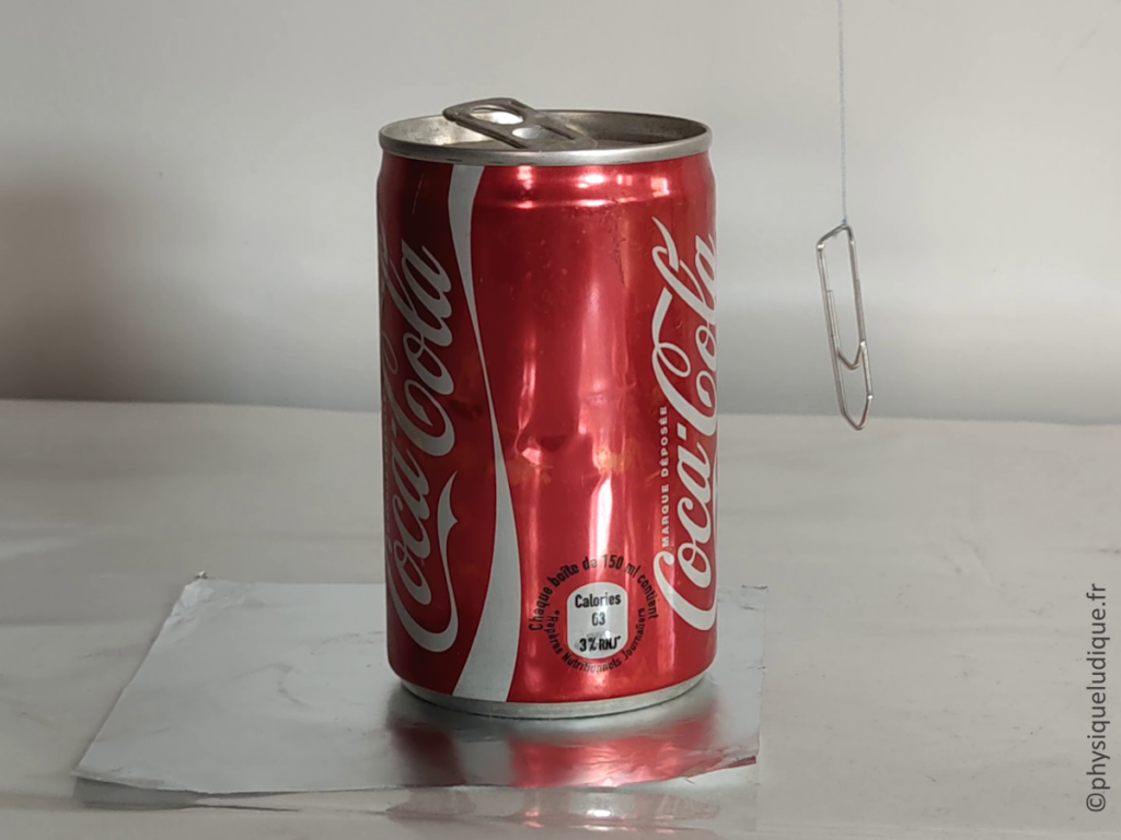 Poser à côté du trombone, à mi-hauteur, la canette métallique, elle même posée sur un morceau de papier aluminium (voir photographie ci-dessous).