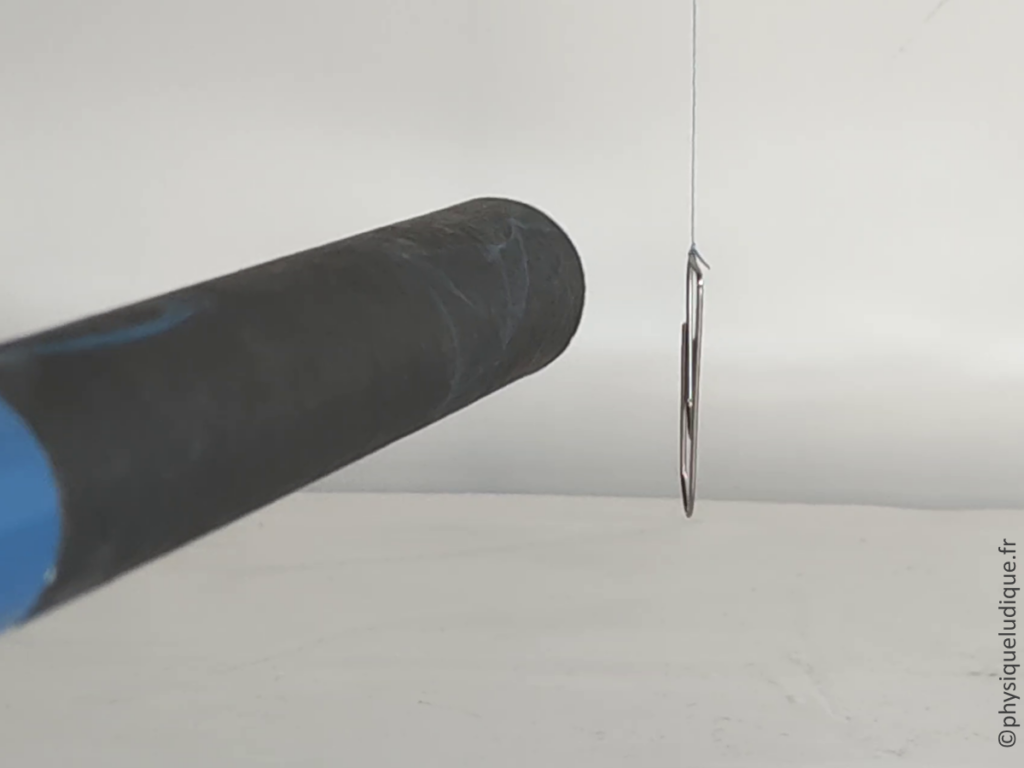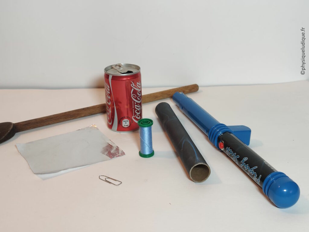Suspendre le trombone à l’aide du fil, en attachant le fil sur le bâton en bois, lui même posé sur deux livres de même hauteur (non présents sur la photographie).