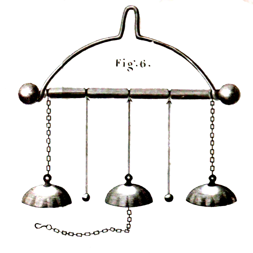 Dans ce dispositif, un pendule métallique est suspendu entre deux cloche métalliques par une ficelle isolante. L’une des cloches est reliée électriquement à la Terre et l’autre est reliée à la source de charges électriques (l’orage). L’oscillation du pendule entre les cloches produit un tintement régulier, comme dans notre expérience. Ce tintement annonce la proximité d’un orage.