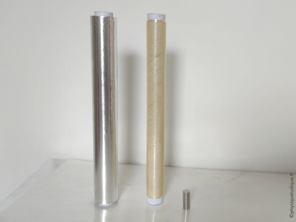 Lorsqu’un matériau conducteur est soumis à un champ magnétique variable, des courants sont induits dans ce dernier. Ces courants s’appellent communément « courants de Foucault« . Le champ magnétique créé par les aimants ici est variable dans le temps dans le matériau constituant le papier aluminium, à cause de la chute libre des aimants. Des courants sont donc générés dans le papier aluminium. En revanche, aucun courant n’est induit dans le film plastique, matériau non conducteur.