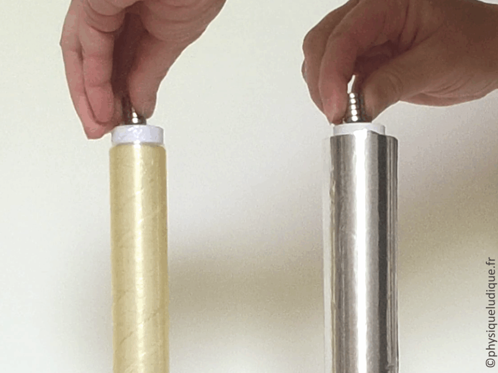 Il est préférable de réaliser cette expérience à deux personnes. Une personne positionne verticalement les deux tubes en les maintenant avec les mains à une même altitude. L’autre personne peut ensuite laisser chuter deux empilement d’aimants identiques à travers les deux tubes en lâchant les aimants au même instant simultanément à l’aide de ses deux mains. Comparer les temps de chute des deux empilements à travers chacun des rouleaux.